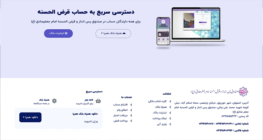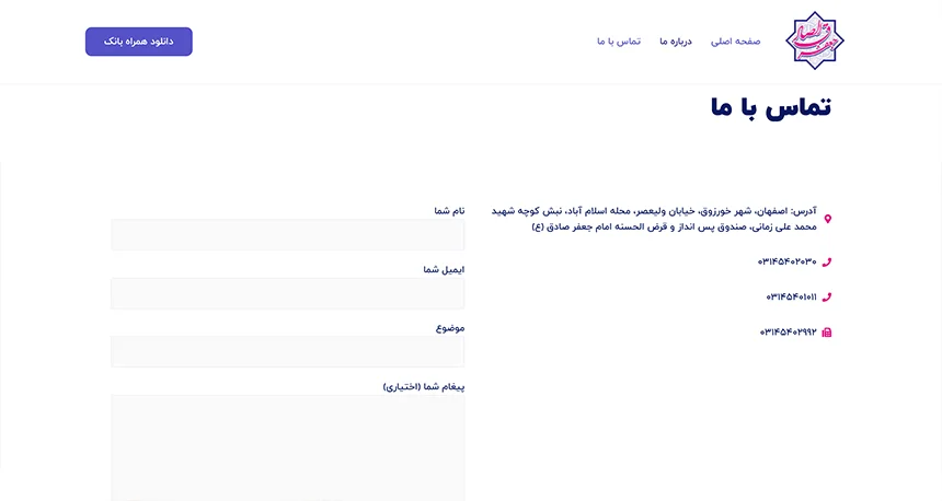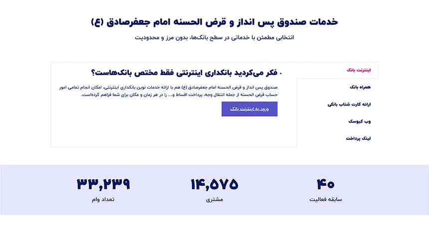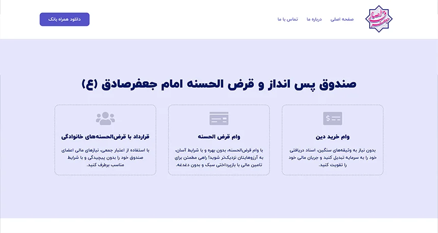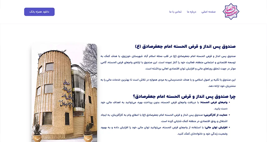 وبسایت صندوق قرضالحسنه امام جعفرصادق (ع) در شهرستان خورزوق (استان اصفهان)، با هدف معرفی خدمات و تسهیلات مالی این مجموعه طراحی شد. این پروژه به سفارش شرکت برنامهنویسان پاسارگاد اجرا گردید.